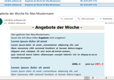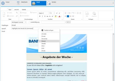 In order to be able to address your recipient personally, your e-mail may be contained in the body or in the subject line. During shipping, these are separated for each recipient, filled with the data from your database.